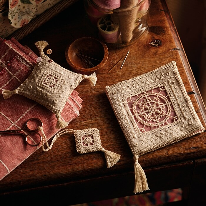 Роза Ретичелла от Ди Киршнер идеально подходит для тех, кто любит традиционную классическую вышивку. Это трио аксессуаров для рукоделия из льна было мастерски создано дизайнером в технике ретичелла.