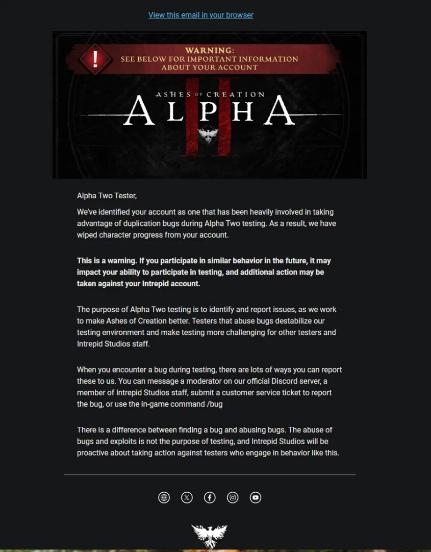 Разработчики MMORPG-долгостроя Ashes of Creation из студии Intrepid обратились с открытым письмом к участникам второго альфа-тестирования. Поводом для него стал обнаруженный дюп вещей (дублирование предметов), а также тех тестировщиков, которые воспользовались этой уязвимостью во зло. “К сожалению, некоторые тестеры воспользовались этой ситуацией, пытаясь использовать ошибки для дублирования материалов, получения золота, создания казны узла и создания легендарного снаряжения. Некоторые тестеры поступали правильно и сообщали нам о проблемах, но ущерб нашей тестовой среде все-таки был нанесен.” Команда удалила все надюпанное, и то, что было с его помощью построено. В бан улетело 100 персонажей. “Пусть это послужит предупреждением. И это сообщение исходит от того, кого также когда-то банили в играх. Ashes of Creation будет другим. Так что не принимайте участие в подобном. Вместо этого — сообщите о таких проблемах. И играйте безопасно, друзья мои.” Спасибо Crowigor за информацию.