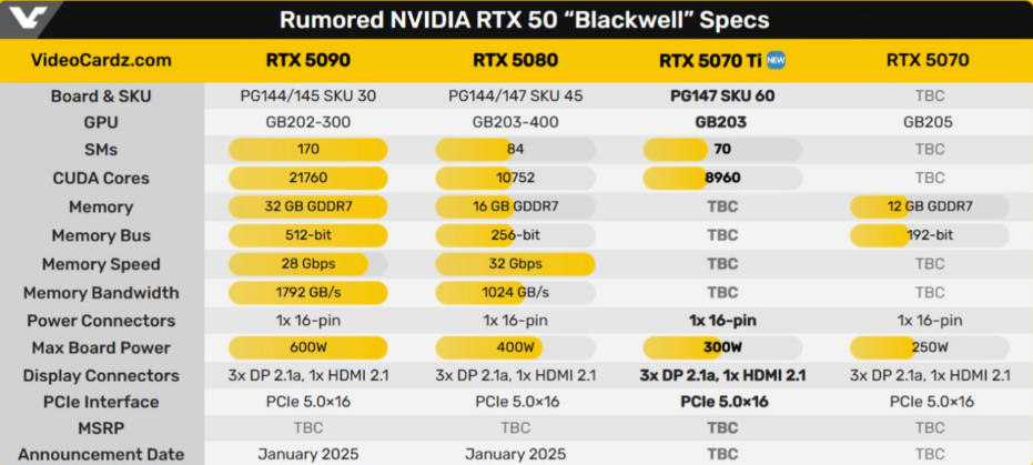 Videocardz опубликовали первые подробности о видеокарте RTX 5070 Ti, ссылаясь на проверенного инсайдера Kopite7kimi. Новинка получит урезанную версию графического чипа GB203 с 8960 CUDA-ядер — это на 17 % больше потоковых процессоров по сравнению с RTX 4070 Ti, у которой их 7680. Теплопакет новинки составит 300 Вт, что немного превышает показатель предшественницы — у RTX 4070 Ti этот параметр равен 285 Вт. Помимо этого, карта будет основана на печатной плате PG147, которая станет основой и для референсных версий RTX 5080. Инсайдер не раскрыл данных о частоте видеопамяти RTX 5070 Ti, но известные спецификации уже намекают на существенное повышение производительности. Увеличенное количество CUDA-ядер, обновлённая архитектура и более высокий TDP могут сделать карту достойным выбором для тех, кто ищет баланс между мощностью и ценой. Пока точная дата выхода RTX 5070 Ti остаётся неизвестной, но слухи о возможном анонсе в первой половине 2025 года усиливаются. Похоже, NVIDIA продолжает подогр