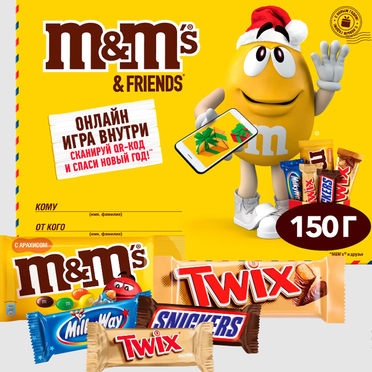 В наборе больший микс из 20 сладостей M&M's, Snickers, Twix, Bounty, Milky Way, Mars. На коробке есть специальное окошко для подписи, а новогодняя игра внутри набора усилит эмоции от подарка.
