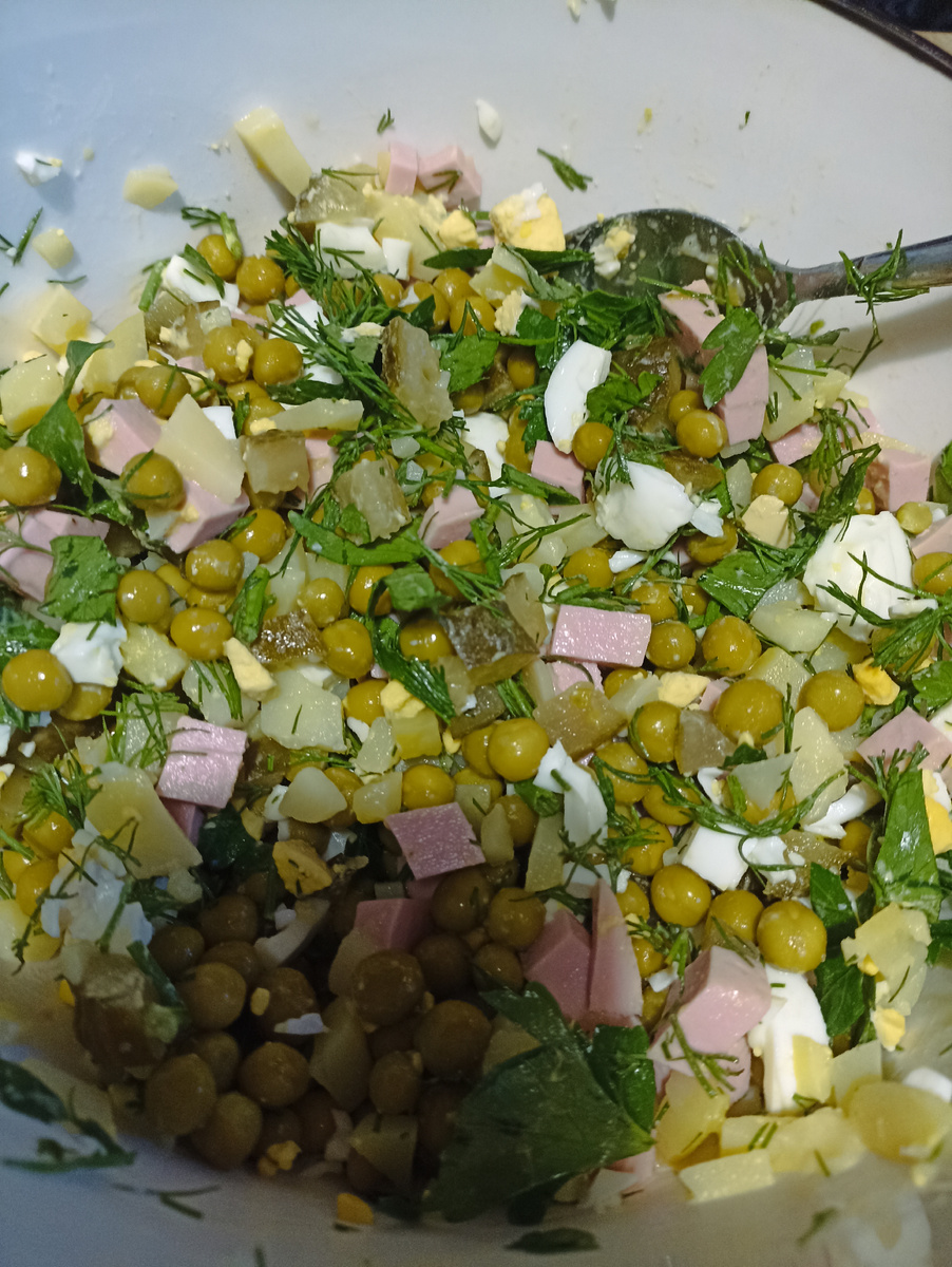 Здравствуйте, дорогие читатели! Решила поделиться с вами своим рецептом салата "Оливье". Ведь каждая хозяйка его готовит по своему. Ингредиенты: Колбаса 300 гр Яйцо 3 шт Огурец малосольный 3 шт Картофель 3 шт Горошек банка Майонез Зелень укропа, петрушка Всё ингридиенты режем одинакового размера. К салату добавляем майонез, убираем пропитываться в холодильник. Такой красивый и вкусный салат получается) Ещё сегодня готовила из остатков картофельного пюре котлетки В пюре добавила 4 ложки муки, яйцо, все перемешала. Можно добавить любую начинку, можно без начинки, на ваш вкус. Обваляла в муке, потом в сухариках и обжарила на масле. Приятного аппетита! !