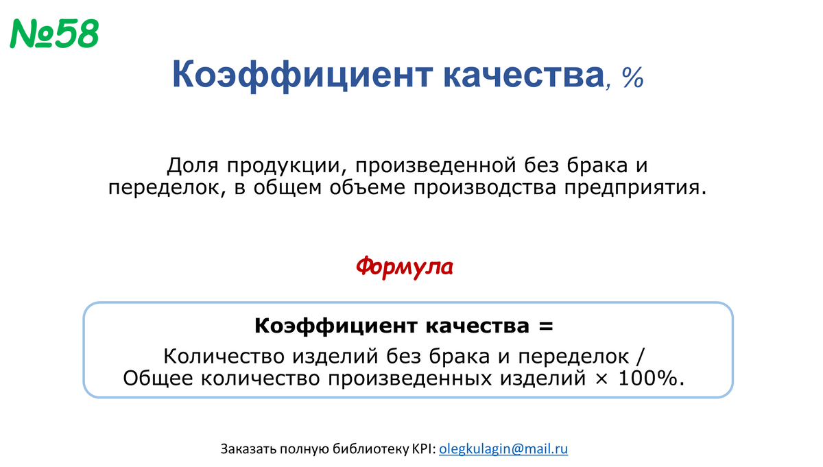Предлагаю вам следующий показатель в вашу копилку ключевых показателей бизнеса. Коэффициент качества, разумеется, может использоваться не только на производстве, но и в сервисных компаниях. ТОП-100 ключевых показателей бизнеса Полная библиотека KPI Программно-методический комплекс KPI-Excel