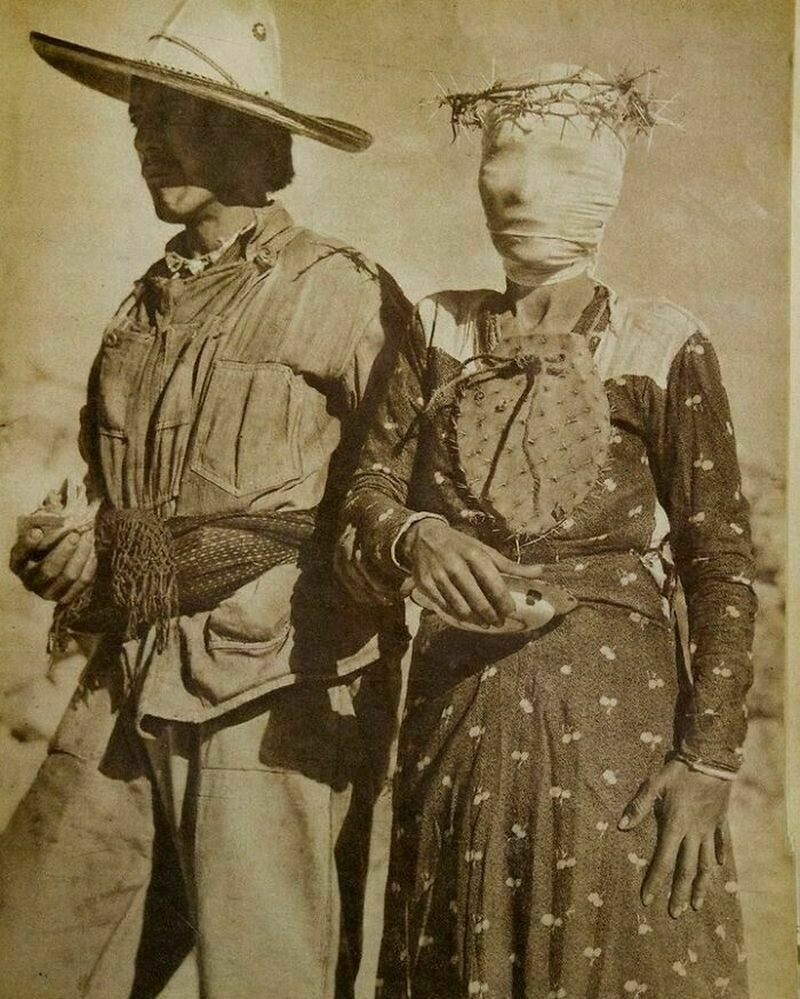 Снимок Энрике Диас - Ярмарка в Сан-Хуан-де-лос-Лагос, 1940 год. Это страстная неделя. Так супружеская пара изображает мучения Христа. Странно, что на этом снимке так одета только женщина... Тряпица на лице должна быть красной «от крови», а на груди женщины мы можем увидеть кактус, который своими иглами колет грудь - как символ истязаний Иисуса.