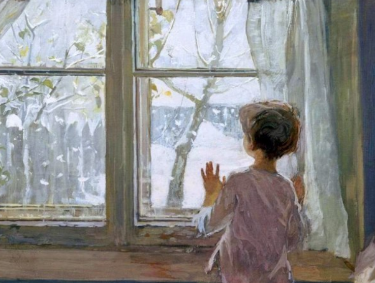 Сегодня мы будем рассматривать картину Сергея Тутунова «Зима пришла. Детство». Это произведение передает атмосферу зимнего утра и полное восторга восприятие детства, запечатлевая момент, когда за окном разверзается белоснежная сказка. На картине изображен мальчик, которому около пяти лет. Он стоит у окна, излучая детское любопытство и радость. Мальчик, показанный со спины, только что проснулся и, облеченный в пижаму, с удивлением раздвинул шторы. В его движениях чувствуется нетерпение и желание увидеть первую зиму, которая загадочно заполнила мир за окном. Этот момент требует внимательного изучения: художник мастерски передал энергетику детских эмоций и восторга. На переднем плане композиции все внимание сосредоточено на маленьком герое. Мы видим, как он прижимается к стеклу, его неаккуратно взъерошенные волосы и незаправленная пижама свидетельствуют о том, что он только что проснулся, а в его глазах сияет неподдельный восторг. За окном разверзлась удивительная зимняя картина: все вокр