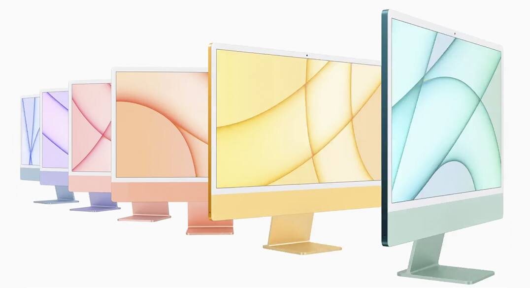 Для нового iMac лишь слегка изменили цветовую палитру корпуса: синий и оранжевый стали более светлыми, розовый и зеленый — ярче, фиолетовый — лавандовым, желтый преобразовался в лимонный, а серебристый остался неизменным. Глобально же внешний вид и дизайн остались без изменений.