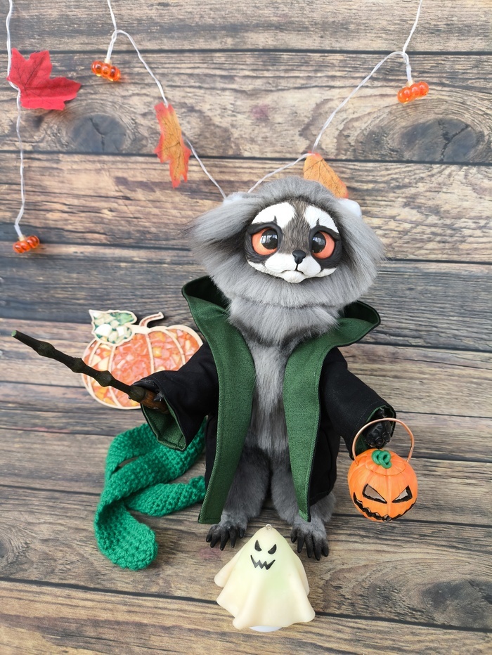 Был у меня заказ на Енота, для девушки, которая любит мистику и Слизерин. К тому же день рождения у неё в Хэллуин. Просили к игрушке добавить аксессуары в теме ГП и Хэллуин. Вот что у меня вышло) Так как основным мотивом была выбрана вселенная Гарри - еноту была сшита мантия, связан шарф и слеплена волшебная палочка. Маленький фонарь Джека и приведение были сделаны в дополнение. Приведение ставится на электрическую свечку, и миленько переливается разными цветами. Материалы: искусственный мех, полимерная глина, кабошоны, смешанный каркас (пластик и проволока), холофайбер, синтепон, краска, бязь, акриловая пряжа, деревянная палочка, электрическая свеча. Пост автора Etyil. Читать комментарии на Пикабу.