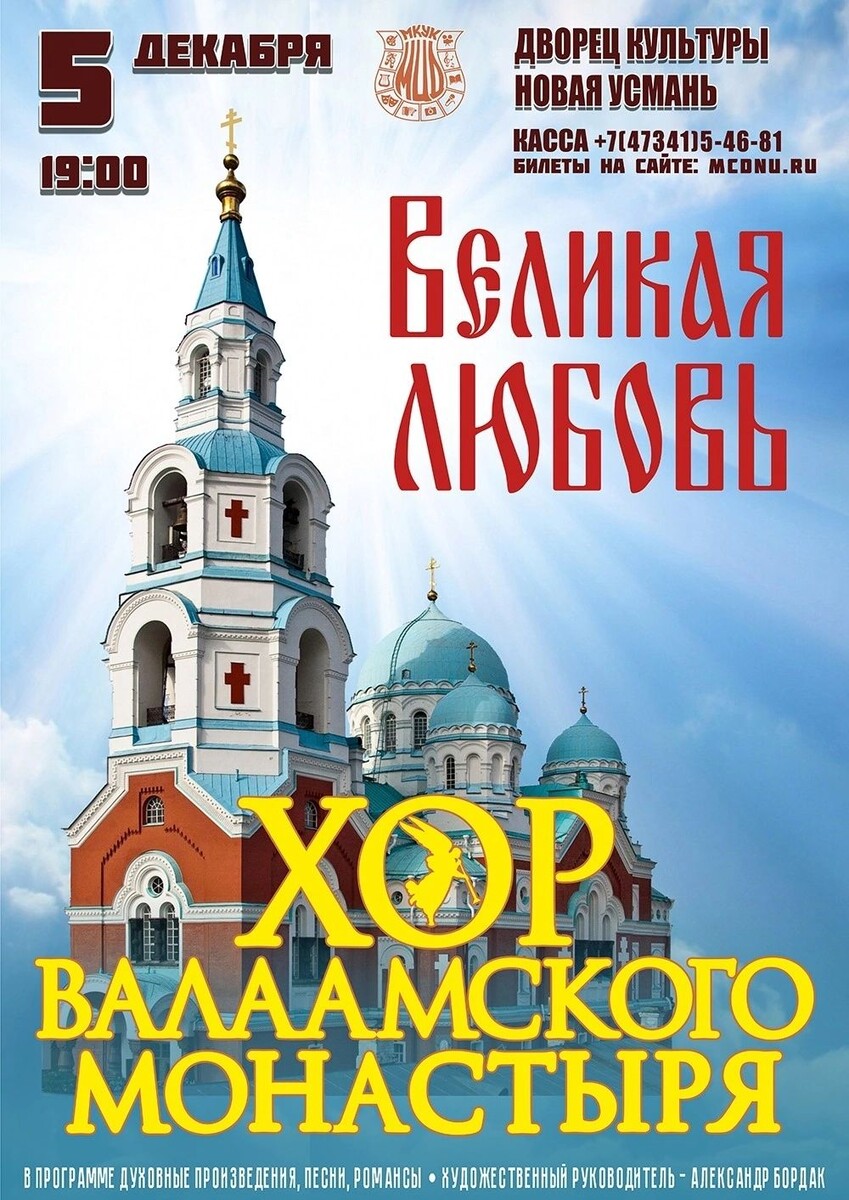 5 декабря в 19:00 в Дворце культуры села Новая Усмань выступит Хор Валаамского монастыря. Мероприятие доступно по Пушкинской карте❗️ Программа концерта носит название «Великая Любовь». Это название позаимствовано у заглавной песни, написанной известным современным поэтом, монахом Валаамского монастыря Амвросием (Дудкиным). Христос олицетворяет любовь, и именно этот смысл пронизывает все мироздание. Основные темы новой концертной программы — создание жизни, человеческая любовь, любовь к Богу и божественная любовь к человеку. В программе представлены песни, романсы и духовная музыка, все тщательно подобрано с акцентом на главную тему — Любовь. На протяжении всей истории человечества мы сталкивались с конфликтами и враждой, зло и ненависть всегда были рядом. Текущие события — это противостояние между добром и злом в сердцах людей. Лишь настоящая, искренняя Великая Любовь способна спасти человечество, направить его и придать силы в решении сложнейших задач. Оставаясь в любви к Богу