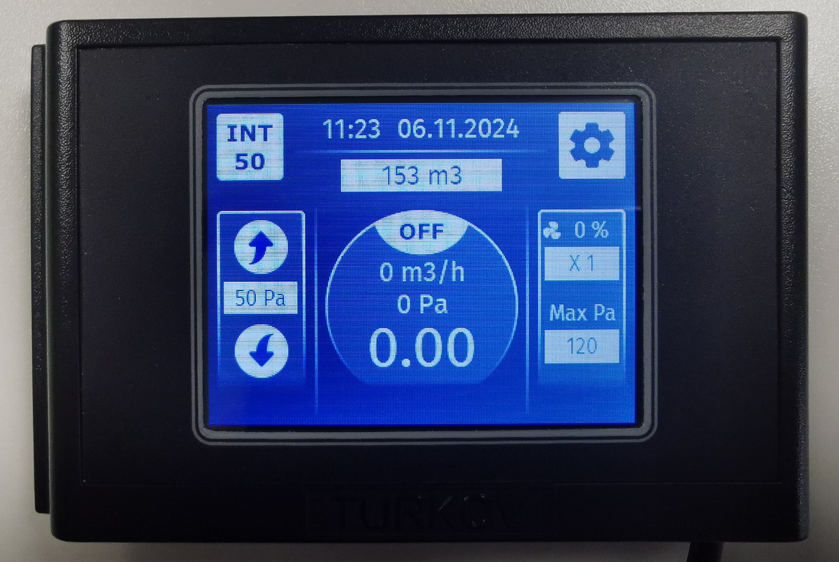 Ручной режим потребуется при ведении работ, требующих периодического открытия и закрытия входной двери, что может привести к некорректной работе оборудования. Во время открытия двери аэроокно зафиксирует падение давления и начнет наращивать мощность работы вентилятора. При закрытии двери перепад дом/улица может значительно вырасти, привести к порче или разрушению конструкций здания. В оборудовании предусмотрена защита от превышения давления (свыше 80 Па), однако при резком скачке она сработает не сразу. Настоятельно рекомендуем не пользоваться дверью, окнами и прочими элементами здания, влияющими на его герметичность, во время проведения теста n50. А при дальнейшем обследовании здания и выявлении утечек желательно перевести оборудование в ручной режим работы (когда точность перепада уже не так важна, а дверь потребуется для наружного обследования). Включение ручного режима 1. Внесите значение объёма дома. 2. Включите аэроокно кнопкой включения. OFF\ON 3. Установите требуемый перепад.