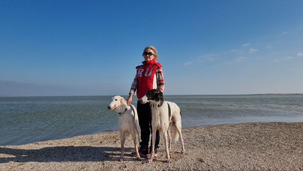 Сезон охоты – долгожданное время для владельцев борзых. Но, как бы ни нравилось нам и собакам проводить время в полях за поиском зайцев, нужно обязательно помнить, что собаки нуждаются в отдыхе. Поэтому, каждые четыре-пять дней мы обязательно устраиваем выходной. Но отдых - это не значит пролежать весь день на кровати. Как говорится: лучший отдых – это смена деятельности. Поэтому, по сложившейся уже традиции, мы обязательно устраиваем себе и собакам «моретерапию», и этот раз не был исключением. Солнечным теплым днем мы отправились в наше любимое место – Ейский лиман Азовского моря. Часто это место встречает нас пронизывающим ветром, а иногда - и моросящим дождем, но в этот раз погода была идеальной. Быстра ездит сюда каждый год, а вот Маэстро предстояло увидеть море впервые. Нам было очень интересно посмотреть, какое впечатление произведет такой объем воды на нашего юного охотника. От отеля, где мы традиционно останавливаемся, до нашего любимого пляжа - примерно пара часов на машине.