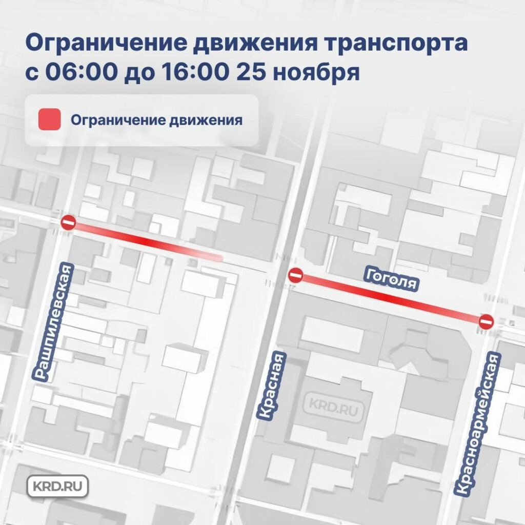 Ограничение затронет участок ул. Гоголя от ул. Красноармейской до ул. Рашпилевской. Улицу перекроют и освободят от припаркованного транспорта, установят соответствующие знаки. Запрет введут в связи с празднованием Дня матери в Краснодарской филармонии им. Пономаренко. Парковочные места на данном участке будут предусмотрены только для участников мероприятия. Жителей и гостей города просят быть внимательными при построении маршрута проезда.