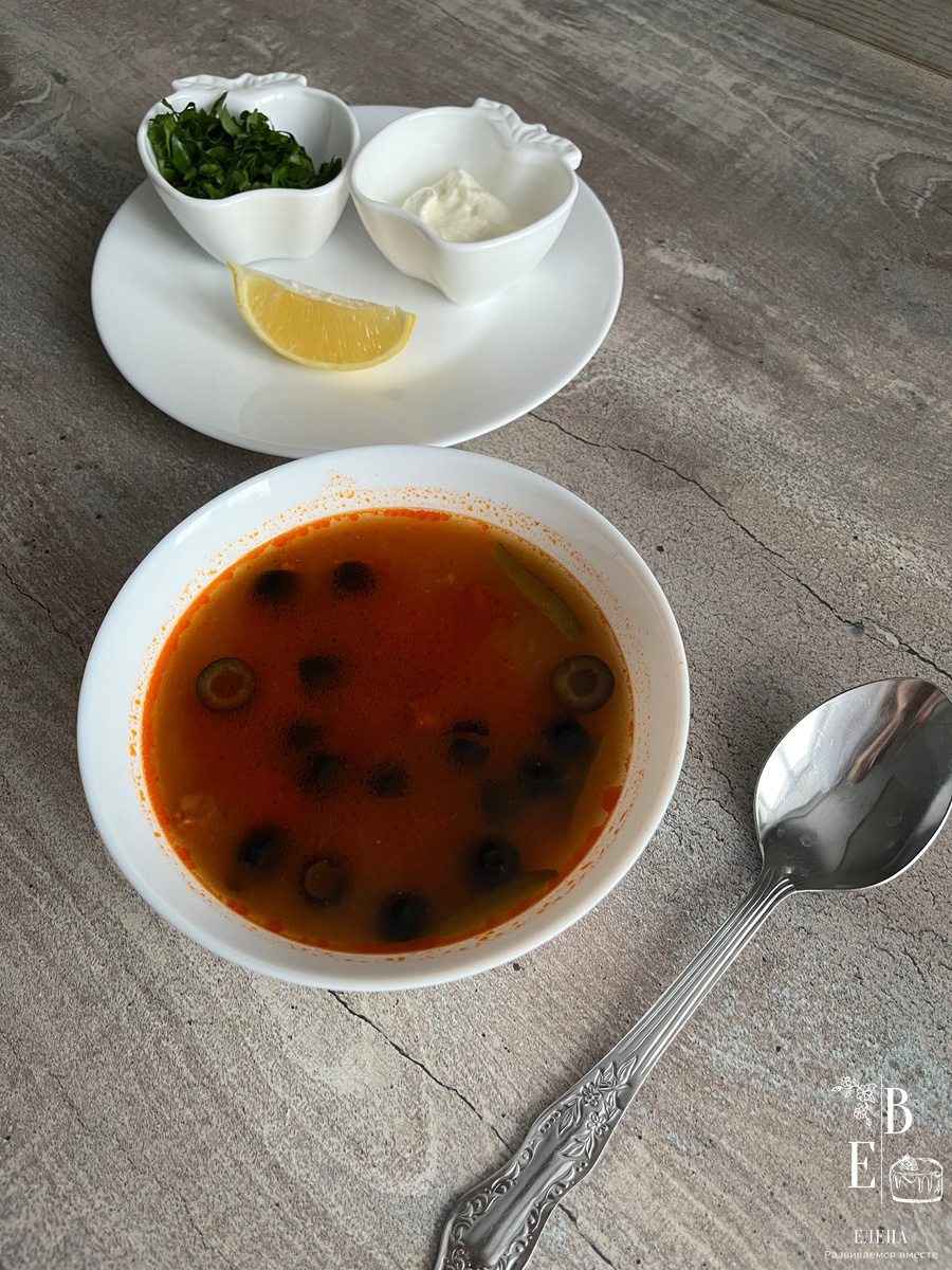 Ингредиенты: - картофель, - говядина, - соленые огурцы, - лук, - томатная паста, - колбаски охотничьи, - колбаса полукопченая, - маслины без косточки, - лимон, - сметана, - зелень (укроп и(или)петрушка). Способ приготовления: Варим бульон из цельного кусочка говядины, длительность варки 1 час. Солить не нужно. Во время варки бульона, в кастрюле образовывается пенка, ее нужно убрать ложкой. Для того, чтобы не капать с ложки, и не пачкать плиту и кухню, я убираю пенку сначала в тарелку, а потом уже выкидываю в раковину. Достаем мясо, режем его брусочками (прямоугольниками) и отправляем обратно в кастрюлю. Картофель чистим, режем кубиками, добавляем в кастрюлю. Соленые огурцы так же режем прямоугольниками. Добавляем их в кастрюлю. Лук чистим, режем мелкими кубиками. Колбасу полукопченую режем прямоугольничками.*, а охотничьи колбаски колесиками, как на фото *Примечание: нарезка полукочевой колбасы прямоугольниками делается примерно одного размера с огурцами и говядиной, чтобы бы