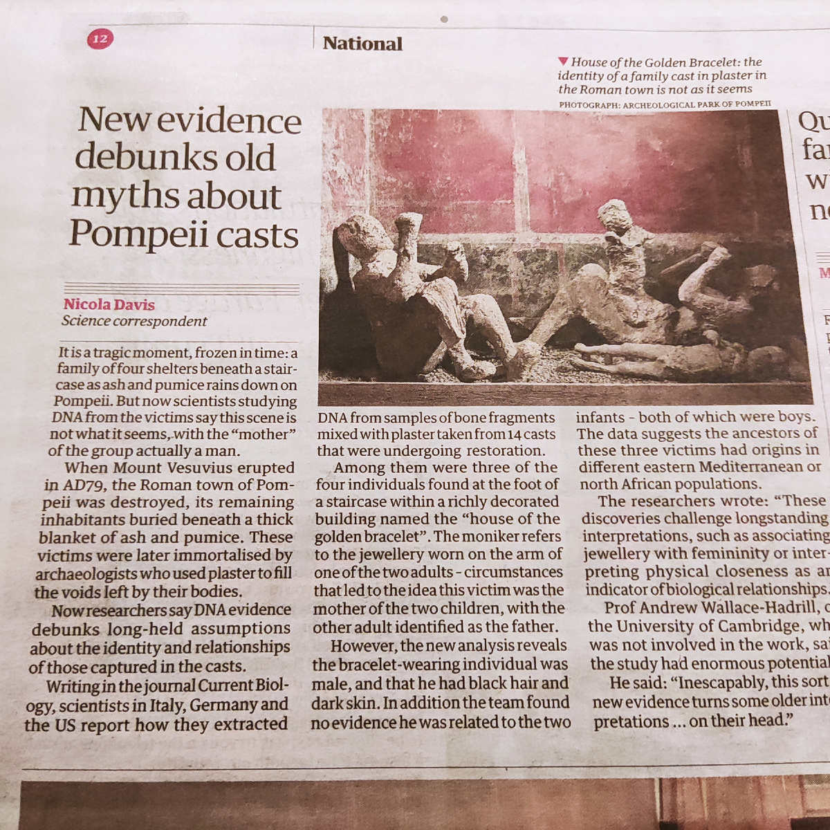 Снова здравствуйте, Дорогие Читатели) В преддверии выходных, и чтобы отвлечь от новостей насущных )) Сегодня хотел бы поделиться с вами короткой статьёй, тема которой взята из той же газеты, в которой (не) упоминали нового старого президента США. Каюсь, часть Читателей ожидала статью про "кошек Помпеи", но слегка подслеповатый автор изначально в полумраке прочитал название как cats вместо того, что бы casts: нет, не кошки Помпеи, здесь "гипсовые слепки", так скорее, надо перевести это многозначное слово. Так, о чём эта заметка в Guardian? Вот об этом фото погибших в Помпеях. Я так понимаю, это достаточно известное место в погребённом городе. Это "застывшая во времени" "семья из четырёх человек" под лестницей в доме, имевшем богатое убранство, и который потом назовут "домом золотого браслета", погребённая под слоями пепла и лавы. Почему так много кавычек? Да потому что многочисленные учёные, взяв пробы костей под гипсом, провели анализы ДНК и выяснили, что "мать семейства", котор