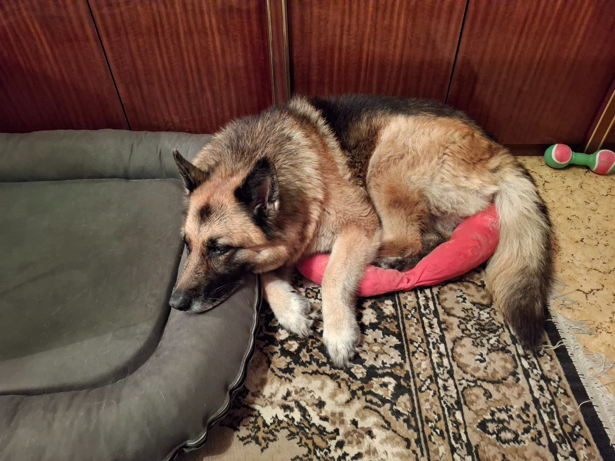 Положили кошке Томе лежанку. А то у собаки Киры есть лежанка, а у кошки Томы - нет.