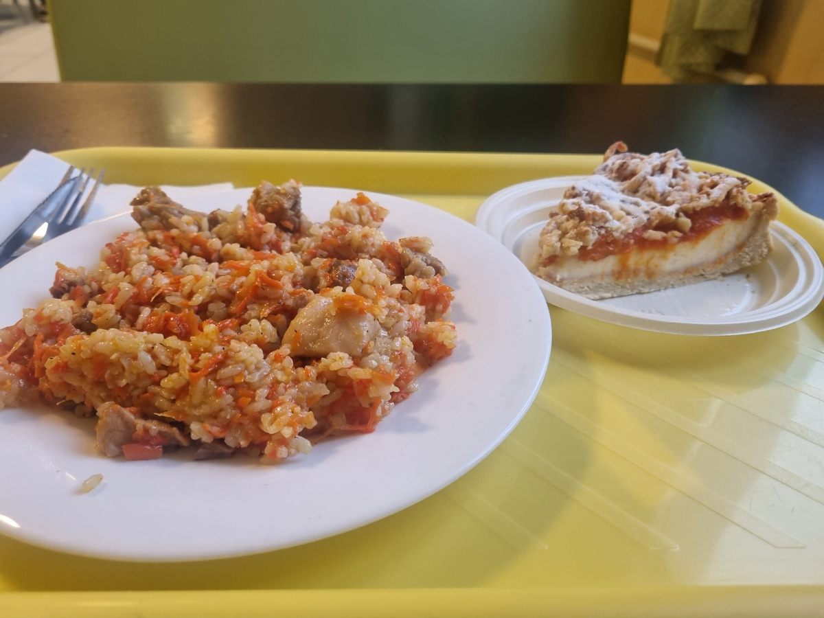 Продолжаю описывать будни мамы и дочки, сегодня у нас на очереди вторая часть рабочей недели. Я стараюсь распланировать наши будничные вечера равномерно. К примеру, если у меня по плану спортзал, то, как правило, заранее приготовлен ужин и дома присутствует необходимый набор продуктов. А готовлю, захожу за продуктами, в ПВЗ в свободные от других дел вечера. Как раз вечер среды предпологал поход за продуктами и готовку, на вечер четверга и пятницы были совсем другие планы. За продуктами я обычно захожу в магазин около детского сада. Потом пакет кидаю в машину, а сама иду за дочкой и мы уже вместе едем домой. Днем лишь сфотографировала свой обед в столовой: плов + песочный пирог с творогом и курагой. Я давно завидовала на этот пирог. Люблю песочное тесто и выпечку с творогом. А тут как раз совпало) Но пирог мне не зашёл. Я его брала в офис - был полдником. Вот на следующий день полдником послужил киш с брокколи и лососем - совсем другое дело. Тесто было одинаковое. Самое основное собы