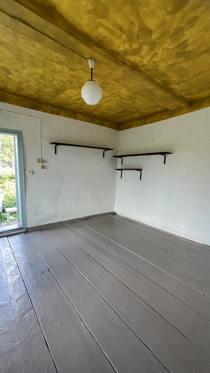 Всем привет! Я Лера, у меня тут целые сериалы о ремонте. В этой статье рассказываю о том, как же я обставила мамину мастерскую в деревне. Первая часть - вот тут. Вторая часть - вот здесь. Остановились мы на том, что я покрасила пол в серый акриловой краской. Кстати, на ютубе меня захейтили за этот пол. У многих был шок от того, что краска для пола может быть не рыжей и без запаха. Также пророчили, что через эти щели поползут мыши и вообще краска смоется. Спойлер - ничего не смылось и мыши не полезли (спасибо трем кошкам за это). Первое и единственное, что я купила сюда из мебели - это большой деревянный стол. Я заказала на озон отдельно подстолья из березы и столешницу из сосны. Про то, как я собрала и обработала этот стол скоро будет видео, наберитесь, пожалуйста, терпения. Пытаюсь вам рассказать как можно скорее обо всех своих проектах, так что советую подписаться, чтобы не пропустить новые серии. Стол мне обошелся примерно в 10 тысяч рублей. Стул взяла старый и покрасила в че