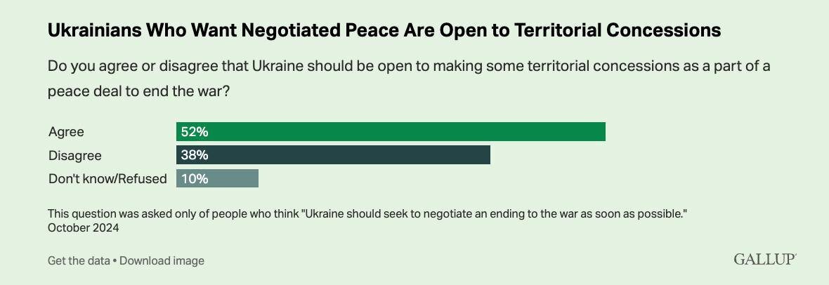 Посмотрим на данные опросов общественного мнения после 1000 дней непрекращающихся боевых действий. 52% опрошенных — за скорейшую остановку боевых действий и переговоры. Те же 52% — допускают, что в ходе переговоров Украина может отказаться от некоторых территорий, ради окончания боевых действий. Против — 38%. 52% выступают за переговоры. За продолжения боевых действий 36%. Итак, 52% и в России и в Украине за мир. Кажется, политики не поспевают за своим обществом. Взбираясь вверх по суицидальной лестнице эскалации, они никак не могут остановиться. Необходимо заключать соглашение о прекращении огня и начинать переговоры. Этого хотят люди обеих стран. Максим Круглов