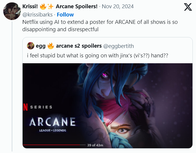 Netflix столкнулся с критикой после размещения постера к второму сезону "Аркейн", который, по мнению зрителей, был создан с использованием искусственного интеллекта. Один из фанатов заметил анатомическую ошибку в изображении руки персонажа Вай — признак, часто встречающийся в работах, созданных ИИ. Бренд-менеджер "Аркейн" Алекс Шахмири оперативно отреагировал на критику в Twitter: "Мы строго против использования ИИ в любом контенте, связанном с 'Аркейн', так как это неуважение к невероятным художникам, которые работали над шоу. Это изображение оказалось ошибкой и уже удалено. Спасибо, что обратили наше внимание." После этого заявления один из пользователей поинтересовался, распространяется ли политика "нет ИИ" и на другие проекты Riot Games, такие как Valorant или League of Legends. Шахмири пояснил: "Я могу говорить только за то, над чем работаю. Лично мне не нравится использование ИИ, потому что искусство особенное благодаря человеческому контакту и эмоциям. Это то, что, на мой взгля