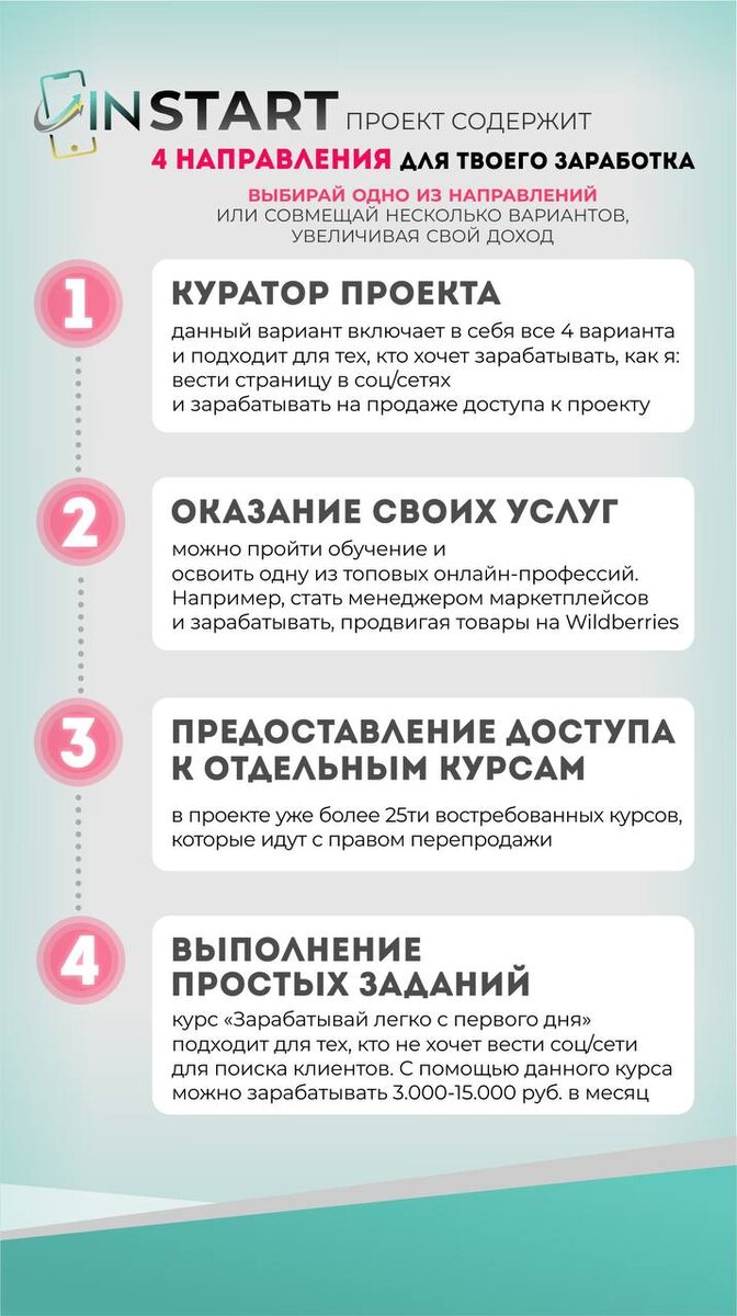 В обучающем проекте «InSTART» за 3.5 года обучились уже более 300.000 учеников. И для каждого ученика есть 3 варианта. Опыт работы не нужен, обучение подойдет для любого новичка. 1️⃣ Самый популярный и прибыльный вариант - КУРАТОР. Здесь тебе нужно вести свою страницу в соц. сети и рассказывать о проекте. Предоставлять доступ другим ученикам и получать от этого доход. На этом варианте можно получать от 50.000 ежемесячно. КУРАТОР ПРОЕКТА🔝 Как зарабатывает куратор проекта и, самое главное, сколько? Это безусловно самый выгодный и прибыльный вариант! Почему? Потому что не нужно профессиональных навыков для заработка и ваш доход будет ограничиваться только вашими амбициями! ВЫ, как КУРАТОР: ✅ получаете БЕССРОЧНЫЙ ДОСТУП ко всем инструментам проекта (курсы, рабочие чаты, рабочие макеты и посты) ✅ получаете право предоставлять доступ людям, заинтересованным также как и вы в обучении и заработке 💰 ПОСЧИТАЕМ: 1. Предоставление доступа в проект - 3000₽ только с одной продажи 1 парт