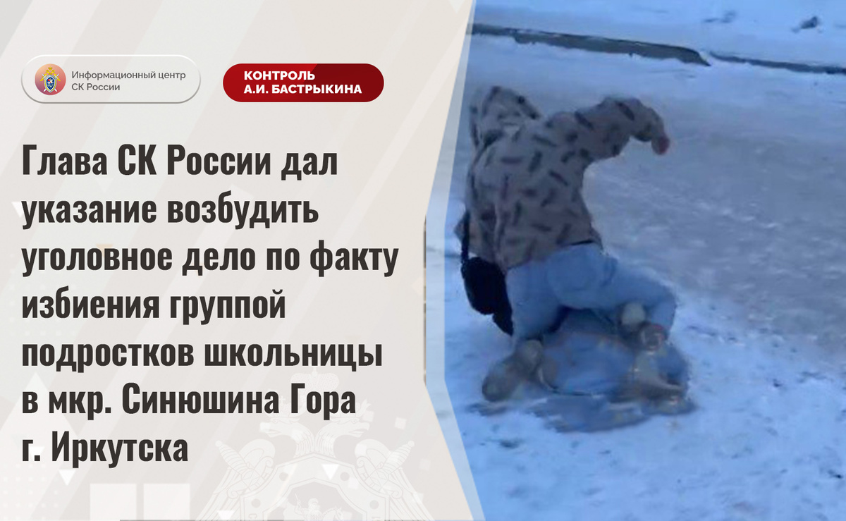 В СМИ и социальных медиа сообщается о совершении группой подростков противоправных действий в отношении школьницы в микрорайоне Синюшина Гора города Иркутска. В ноябре текущего года несовершеннолетние избили девочку, а также высказали в ее адрес угрозы физической расправой. Происходящее фигуранты снимали на камеру мобильного телефона, после чего распространили запись в социальных сетях. В СУ СК России по Иркутской области по данному факту организована процессуальная проверка. Председатель Следственного комитета Российской Федерации Александр Иванович Бастрыкин дал указание руководителю СУ СК России по Иркутской области Анатолию Викторовичу Ситникову возбудить уголовное дело и представить доклад о ходе и результатах его расследования. Исполнение поручения поставлено на контроль в центральном аппарате ведомства. #СледственныйКомитет #СКРоссии #СКР #ИЦСКР