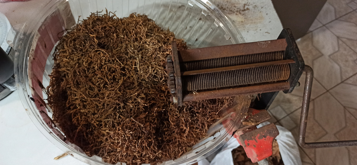 Данный табак хранил всё лето при температуре +30 градусов. В коробке, изредка переворачивая. Перед этим листья плотно утрамбовал в влажном состоянии когда были и положил под гнет весом 5 кг. У меня получилось несколько таких брикетов. Один из них, сегодня решил пустить в дело. Очень любопытно было какие изменения в нем за это время произошли. Предварительно добавлю, что лето 2023 года он висел на чердаке. Из видимых изменений – большая часть нижнего яруса превратилась в труху. Напоминаю. Курение вредит Вашему здоровью. Перебрал, центральную жилку удалил Первое что порадовало – аромат! Из обычного травяного он стал табачным. Работать с ни было приятно. Нарезал на своей старой машинке длинной лапшой. Забивал в стандартные гильзы смокинг с 15 мм фильтром, не плотно. Дело в том что он крепкий, и не хотелось с половины сигареты "улететь". С старта сигареты вкус табачный без примесей, на трети добавилась ещё нотка травянистости, а далее вкус пошел выраженный табачно-медовый с нотой травянис
