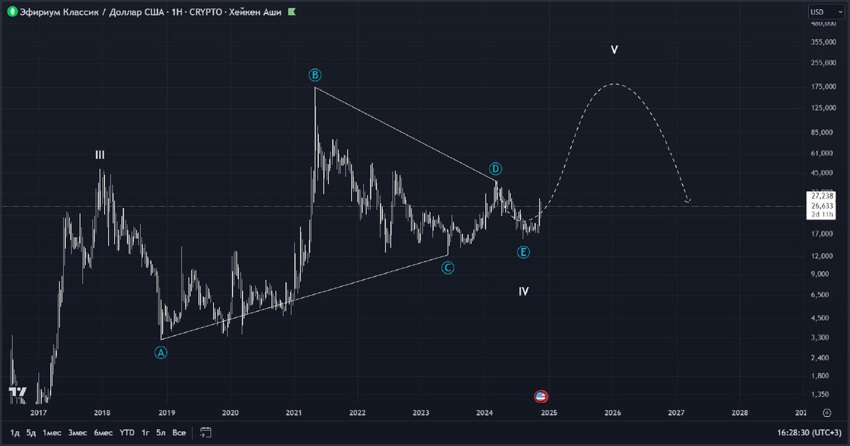 💰 Ethereum Classic Таймфрейм: W Глобальный сценарий актуален. Треугольник находится в финальной стадии своего формирования. Ожидаю реализацию потенциала фигуры в районе 200.00, далее начало медвежьего рынка. Криптовалютой торгую на бирже Bybit. #BTC #ETC