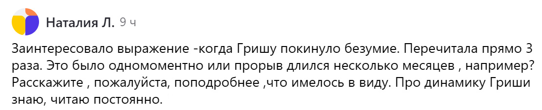 Что я имела ввиду, говоря, что Гришу покинуло безумие? И что это за период?