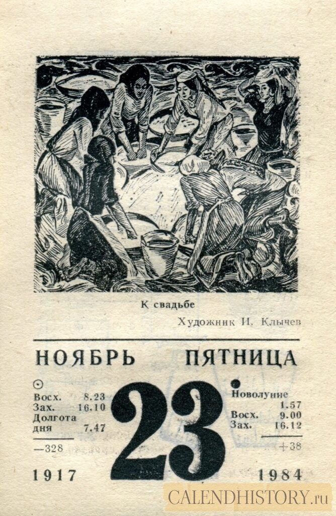 Итак, сегодня 23-го ноября и у нас на календаре 1984-й год. Перед нами листок советского календаря для женщин за этот день. На календаре у нас пятница - 23 ноября 1984-го года. К свадьбе Художник И. Клычев *** Оборотную сторону листка этого календаря можно посмотреть у нас по ссылке на сайте. Другие листки советских календарей смотрите у нас на сайте - CALENDHISTORY.ru ДРУГИЕ ЛИСТКИ ОТРЫВНЫХ КАЛЕНДАРЕЙ: