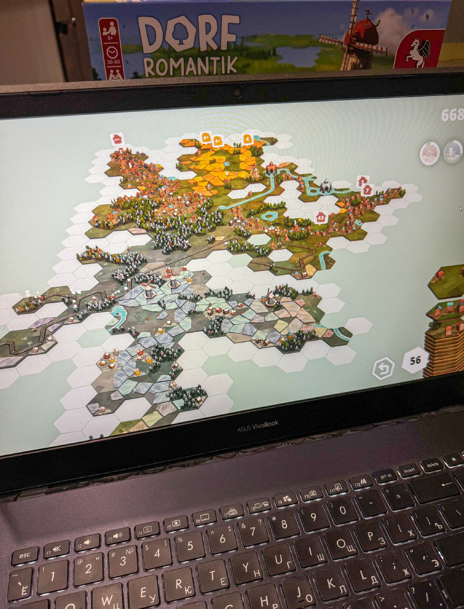 Скажу пару слов о том, что, если вы любите тайлоукладывательные игры, «Дорфромантик» прекрасно играется и «взрослым» составом: здесь большой простор для решений (и глупых ошибок) — конечно, мы с Виталей сразу же без особых достижений набрали 300+ (с Никой пока было максимум 250), но могли бы и больше, если бы не совершили несколько глупых ошибок в расположении жетонов.