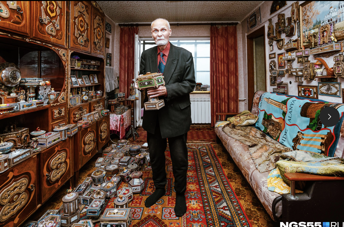 Самое сердце квартиры — зал. Дверцы деревянного шкафа здесь украшены резными узорами. На полках, пестром ковре и даже на стенах — сотни необычных шкатулок. — Это всё своими руками сделано, — радостно говорит Борис Николаевич. Мастер суетится и водит нас из одной части квартиры в другую, открывает многочисленные шкафчики, в которых прячутся шкатулки. Ему хочется всё нам показать.