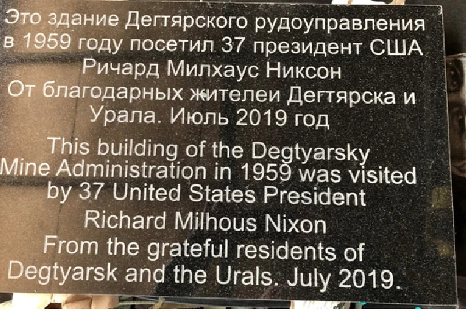 В Дегтярске полиция задержала местного жителя Петра Кикилыка, попытавшегося установить памятную табличку в честь 37-го президента США Ричарда Никсона, который будучи еще вице-президентом, приезжал в город с визитом в 1959 году в рамках своего турне по СССР. Об этом сообщил правозащитник Сергей Зыков, писал портал E1 14 июля 2015 года. По его словам, россиянин собирался разместить ее на здании бывшего рудоуправления, однако местные власти не согласовали данную акцию. В результате на место прибыли сотрудники полиции и задержали 75-летнего мужчину, изъяв табличку из багажника его автомобиля. В 1959 году Ричард Никсон, занимавший тогда пост вице-президента Соединённых Штатов Америки, совершил официальный визит в Советский Союз. Он посетил Урал и провёл два дня, знакомясь с достопримечательностями областного центра. См. статью https://dzen.ru/a/ZzxOi6EjsBmU1XqW?share_to=link Однако в какой-то момент свита журналистов, сопровождавшая гостя, узнала, что на следующий день американская делегац