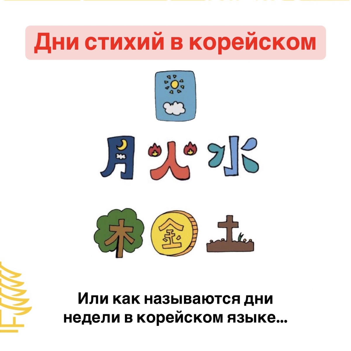 Огромное количество лексики в корейском языке пришло из Китая. Часто за слогом может стоять какой-нибудь китайский иероглиф. Дни недели в этом плане не стали исключением. Можно подумать, что корейцы просто заимствовали из китайского слова на свой лад. Однако не все так просто 😊 Каждое слово завершает словосочетание 요일 [ёиль] - "день недели". Все различие приходится на первый слог, который обозначает какую-либо природную стихию или небесное тело. А в некоторых случаях - и то и другое. Давайте же разбираться, какому дню, что соответствует 👇 일요일 [ирёиль] —воскресенье 일 [иль] - из китайского 日 [rì]– Солнце ☀️ 월요일 [ворёиль] — понедельник 월 [воль] - из китайского 月 [yuè] — Луна 🌙 화요일 [хваёиль] — вторник 화 [хва] - из китайского 火 [huǒ] — огонь (화성 - Марс) 🔥 수요일 [суёиль] — среда 수 [су] - из китайского 水 [shuǐ]– вода (수성 Меркурий) 🌊 목요일 [мог'ёиль] — четверг 목 [мок] - из китайского 木 [mù] – дерево (목성 Юпитер) 🌳 금요일 [кымёиль] — пятница 금 [кым] - из китайского 金 [jīn] – металл (금