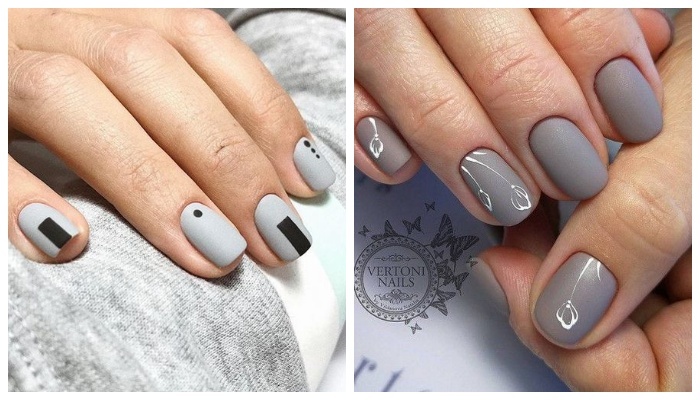 Сегодняшний материал посвящен актуальному дизайну маникюра, который отлично будет сочетается с любым вашим образом. Этот подборка будет для многих источником вдохновения. Если вам по нраву минимализм и лаконичность в маникюре, рекомендуем обратить внимание на изысканный геометрический дизайн. На картинке представлен яркий пример серого маникюра с матовым покрытием, украшенного контрастными геометрическими узорами. Серое однотонное покрытие + черный геометрический принт + глянцевый топ — идеальная комбинация для трендового маникюра, который превзойдет все ваши ожидания. Такого плана дизайн отлично будет перекликаться, как с праздничным нарядом, так и повседневным вещами. Обратите внимание, как однотонное серое покрытие заиграло новыми красками, благодаря стильному золотому дизайну в виде фольгированных полосок. Ногти миндалевидной формы, покрытые серым цветом и матовым топом, нейл мастера предлагают украсить белоснежным дизайном. Обратите внимание, как ногтевая пластина визуально удлин