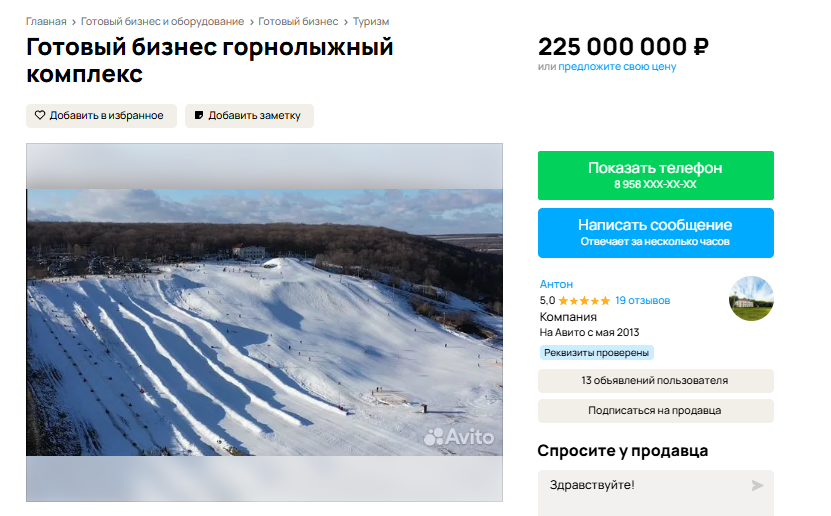 В Воронежской области все еще продают горнолыжный комплекс «Донгор». Его цена составляет 225 млн рублей, о чем свидетельствует ноябрьская информация на сайте «Авито». Примечательно, что готовый бизнес уже давно пытаются продать, однако, судя по всему, покупатель не находится. В январе «Блокнот» уже писал о попытках продать этот комплекс. Тогда цена составляла ровно столько же – 225 млн. За десять месяцев продавец не уступил ни одного миллиона. Добавим, в комплекс, расположенный на берегу реки Дон, входят шесть участков земли площадью 15 га, несколько зданий, открытые беседки, веранды и многое другое (снежные пушки, снегоходы, лыжи, сноуборды, подъемники, тюбы, освещение). Филипп Котов