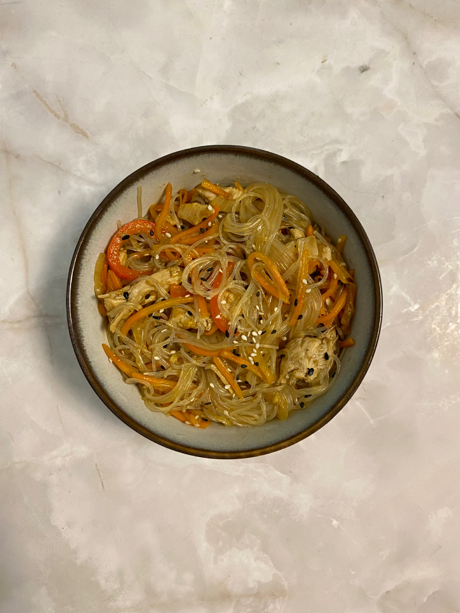Ингредиенты: Куриное филе – 500 гр Фунчоза – 250 гр Репчатый лук – 150 гр Морковь – 200 гр Сладкий перец – 1 шт Чеснок – 3 зубчика Корень имбиря – 15 гр Растительное масло – 3 ст.л Соевый соус – 150 гр Кунжут Соль Молотый черный перец Приготовление: Куриное филе нарежьте полосками. В сковороде нагрейте половину растительного масла, положите в нее куриное филе и, помешивая, обжарьте на сильном огне до корочки со всех сторон. В конце немного посолите и поперчите. Фунчозу положите в большую кастрюлю, залейте кипящей водой (уровень ее должен быть выше лапши на 2 см), плотно закройте крышкой и оставьте фунчозу на 7 минут. Лук, морковь и перец очистите и нарежьте тонкой соломкой. В ту же сковороду, где жарилась курица, налейте оставшееся масло. Выложите все подготовленные овощи и обжарьте на сильном огне, помешивая, до легкой корочки (8-10 минут). Для соуса чеснок и имбирь очистите и нарежьте мелким кубиком. Соедините с соевым соусом и кунжутом. Фунчозу откиньте на сито и дайте стечь