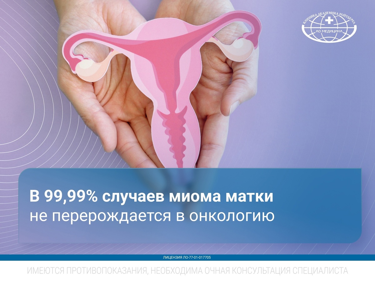 По статистике, каждая 4-я женщина в репродуктивном возрасте подвержена миоме матки. Это доброкачественное образование, а значит, оно не переродится в рак в 99,99% случаев, что подтверждается мировыми исследованиями.