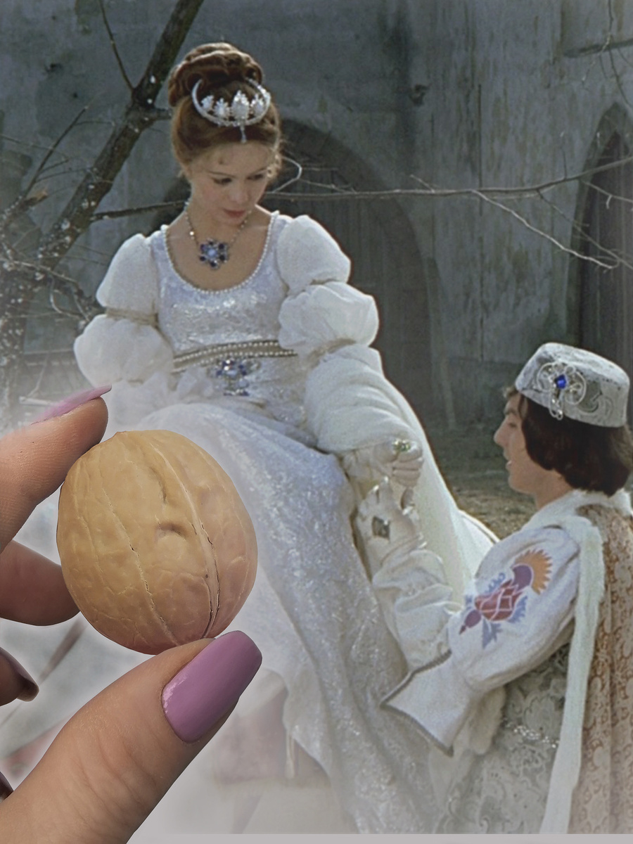 Вторым орешком она приобрела себе прекрасное голубое платье и золотые туфельки. Что говорит о том, что она не остановится на полпути и не позволит отобрать свое жизненное пространство. А ведь там есть злые сестры. Надеюсь, вы понимаете мои ассоциации?