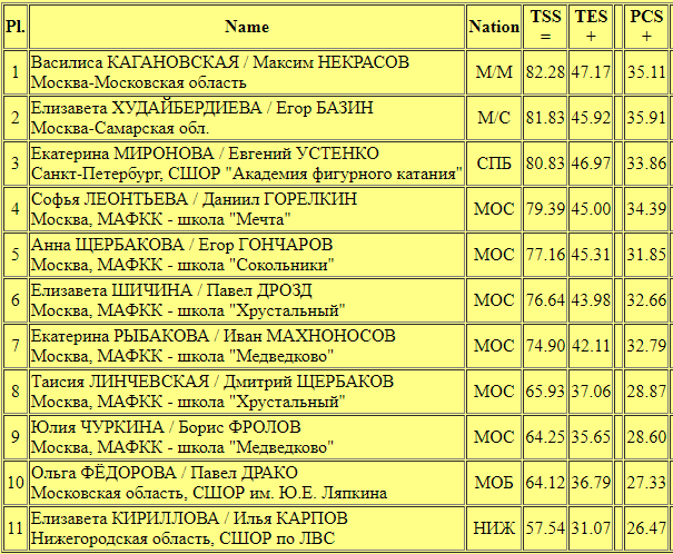 Как принято в таких случаях говорить - к такому жизнь меня не готовила. Что характерно - за редким исключением не было "постпрокатных" обработок техники. Сколько изначально дуэты получали в онлайн-режиме, столько же мы потом видели в протоколе. При этом компоненты выставлялись согласно существующей сейчас "табели о рангах", что мы можем очень четко проследить. Болельщики одних дуэтов ликуют, других паникуют. Если вам интересно мое личное мнение, то вот Топ-3 сегодняшних прокатов, исключительно исходя из моих эмоциональных впечатлений : 1 место - Анна Щербакова/Егор Гончаров, 2 место - Василиса Кагановская/Максим Некрасов, 3 место - Софья Леонтьева/Даниил Горелкин.