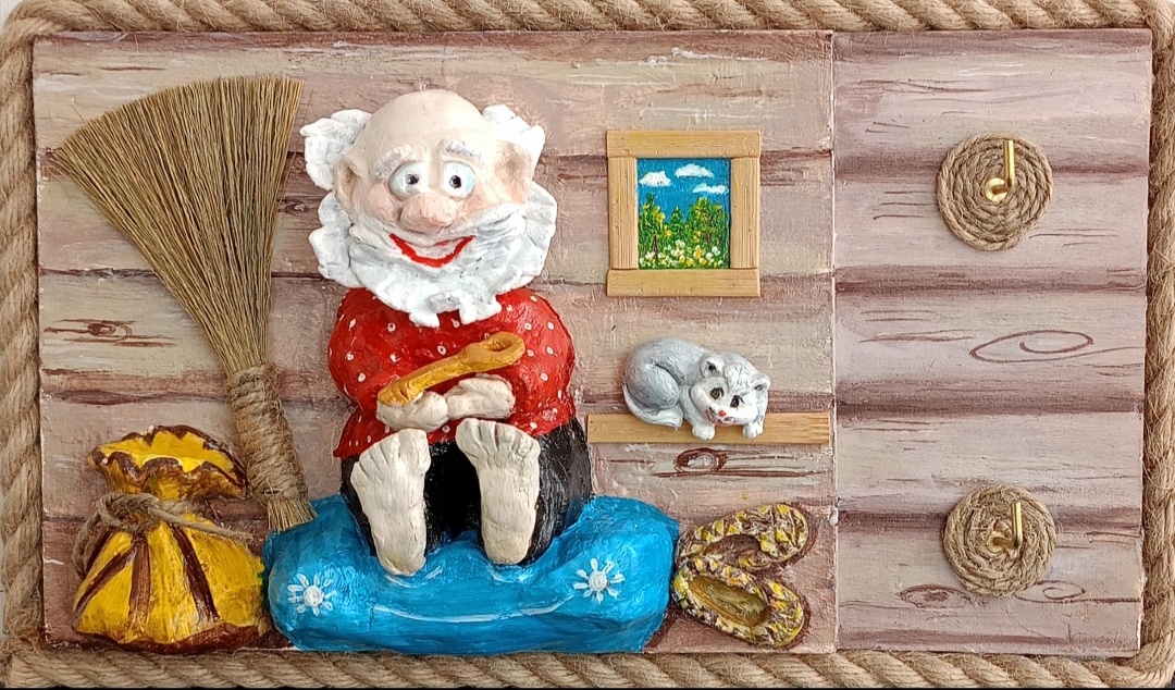 Добрый день, дорогие друзья! Совсем недавно я познакомила вас с настенными ключницами. А сегодня пойдёт разговор о ключницах, которые несут оберег для дома, в частности, это фигурка домовёнка у нас его зовут Кузей . Он, уютненько устроился на мягкой подушке в окружении предметов- помощников. -веничком он очищает дом от негативной энергии, и от недоброжелателей. -мешочек наполнен зерном, денюшками. Для денежного благополучия и достатка. За окном видны дивные просторы. Рядом пристроился котик и лапти. В руках Кузи, ключик с прицелом на новый дом. Вот такая ключница весит у нас, весёлая улыбка Кузи всегда настраивает на позитив. Покажу ещё одну ключницу на эту же тему. В изготовлении использовалась -фанера, глина, мелкие спилы, галька, цветочки, акриловые краски, лак, крючки, петля. Персонажей на этой ключнице немного больше и все тоже несут смысловое значение. Как заметили крючков больше и такая ключница подходит для большой семьи. Конечно, кто верит в помощь и способность всех п