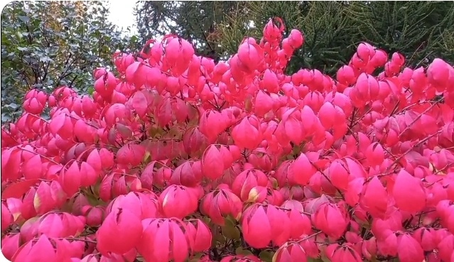 Осень. Гуляем в Александровском саду ( Москва) и видим удивительное украшение этого сада на фоне жёлто-зелёной листвы – красные листья бересклета крылатого. Все туристы желают здесь сфотографироваться. На фоне бересклета крылатого. В нашем холодном зимой климате на фоне красоты, ёлок, сосен – это замечательное растение, кустарник, может украсить многие сады. Надо отметить, что у нас, в России, бересклет растёт на Дальнем Востоке. Но родиной бересклета является Япония, Китай. Удивительный кустарник. Удивителен своей своей красотой, особенно осенью. Красная листва, густая, бархатистая. Не просто красная, а глубокий розовый цвет, малиновый цвет покрывает этот кустарник. Плоды этого кустарника – оранжевые или красные. Они ядовиты. Особенно они привлекают своими яркими красками детей. Оберегайте от них детей. Бересклет любит солнце и поэтому осенью покрывается такой красивой, ярко-красной листвой осенью. Этот кустарник любит воду, любит хвойные леса, где и произрастает. Береск