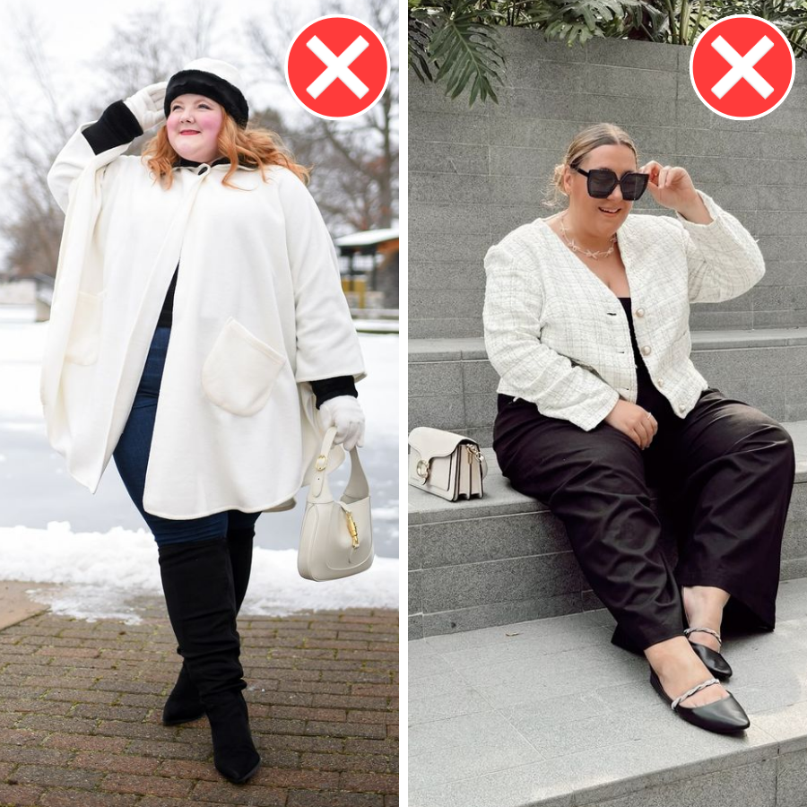Крой и длина изделия тоже играют важную роль. Например, если выбрать бесформенный свитер из тонкого трикотажа, который заканчивается в самой широкой части бедер, ничего хорошего для фигуры он точно не сделает. А вот если заменить его на жакет приталенного силуэта — уже выглядит лучше. Фигура «подсобирается», и объемы становятся менее очевидными.