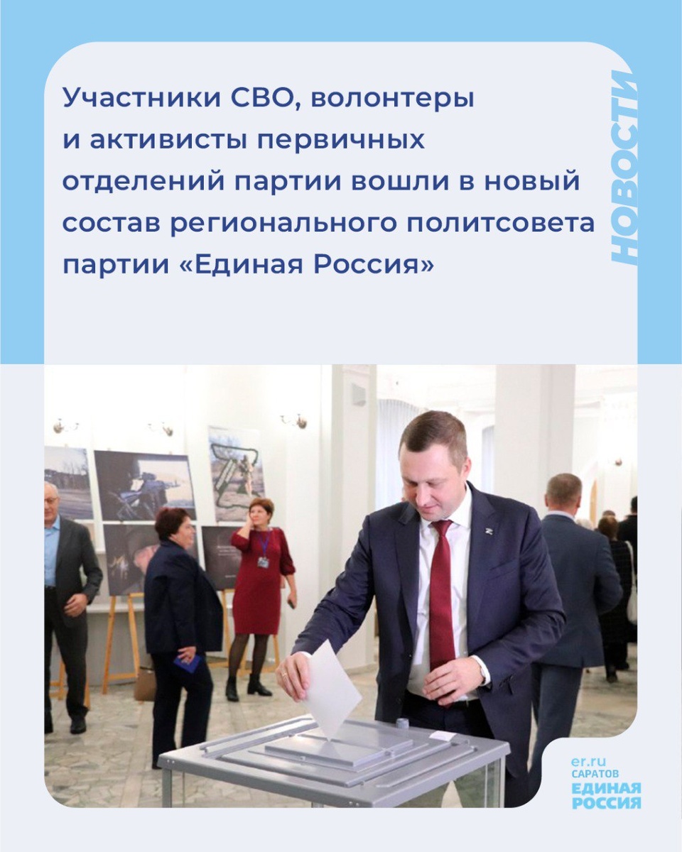 🇷🇺Участники СВО, волонтеры и активисты первичных отделений партии вошли в новый состав регионального политсовета партии «Единая Россия» Сегодня в Саратове проходит региональная Конференция партии «Единая Россия». 👥В работе Конференции принимают участие делегаты из всех районов области, среди которых ветераны СВО и секретари первичных партийных организаций, депутаты различного уровня. Общим голосованием был обновлен состав регионального политического совета и избран президиум политсовета. 📄Полный список состава регионального политического совета смотрите на сайте реготделения Единой России.