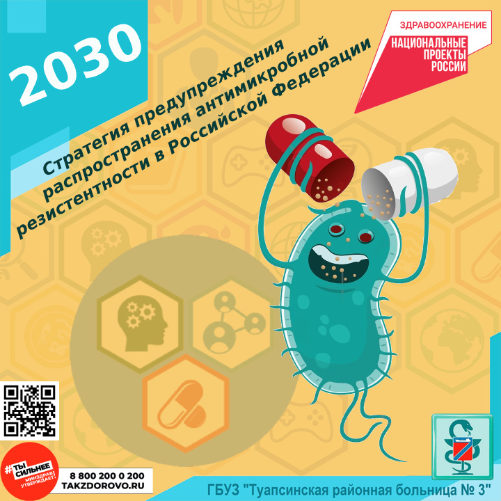 В нашей стране действует Стратегия предупреждения распространения антимикробной резистентности, утверждённая Правительством РФ на период до 2030 года. Стратегия определяет задачи по сдерживанию биологической угрозы и направлена на предупреждение и ограничение распространения устойчивости микроорганизмов к противомикробным (в том числе противовирусным, противогрибковым и противопаразитарным) препаратам, а также устойчивости микроорганизмов, включая вредные организмы растений, к иным противомикробным химическим и биологическим средствам, в том числе пестицидам. Реализация Стратегии позволит: - привить населению мысль о недопустимости самолечения антибиотиками; - повысить эффективность профилактики и лечения инфекционных заболеваний; - уменьшить число случаев инфекционных заболеваний, вызванных микроорганизмами со множественной лекарственной устойчивостью; - снизить смертность среди населения. Подробнее: https://hosp23.ru/news/617-antimicrobnayastrategyya.html