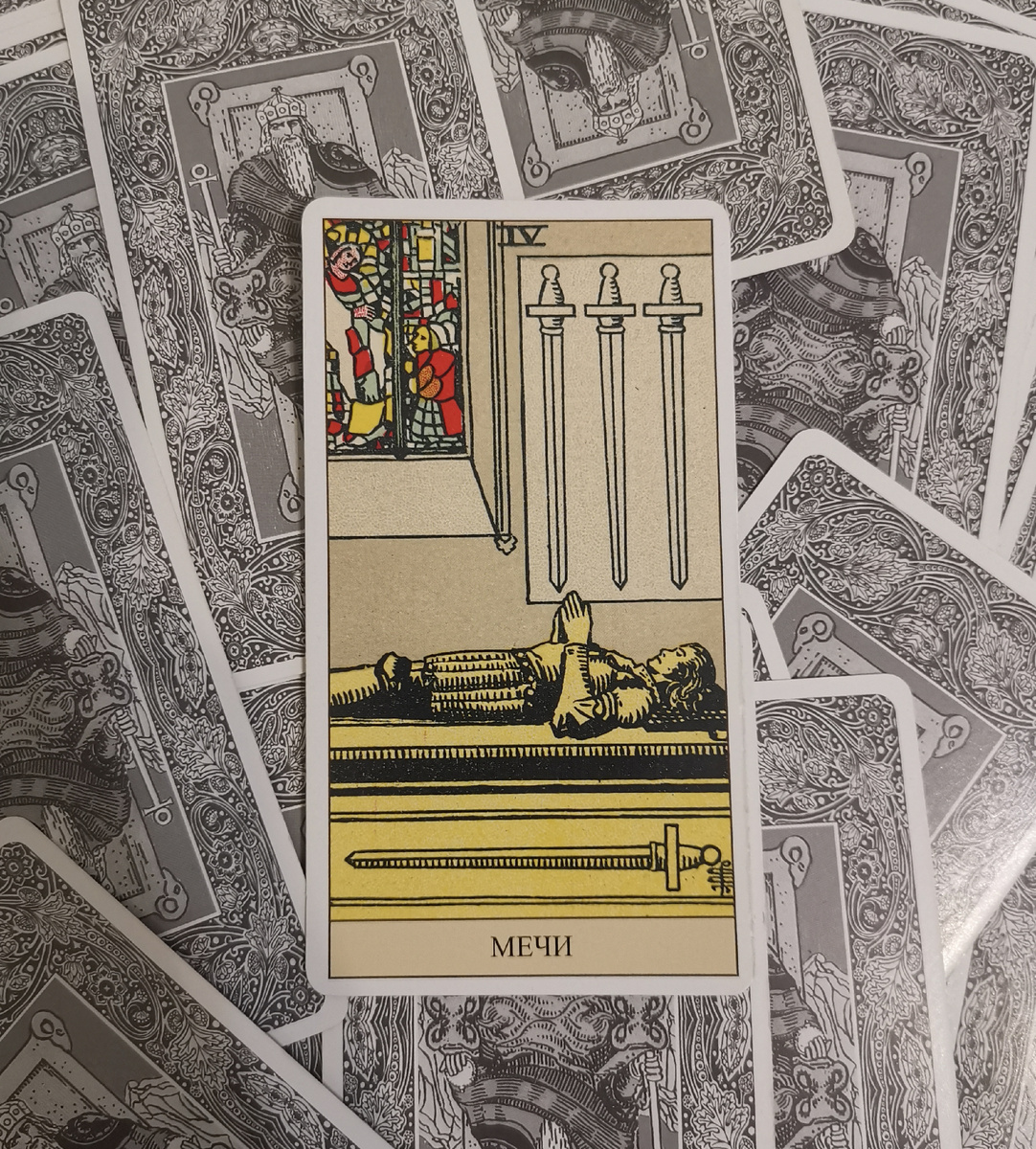 Структура - главная тема четверок в системе Уэйта, но здесь у нас получается некоторая натяжка. Воздух сопротивляется структуризации, об этом знает каждый, кто хоть раз пробовал удержать внимание на одном единственном объекте, так что структура возникает только при отсутствии стимуляции. Картинка этой карты кажется сценкой из сказки: зачарованный рыцарь, пробудить которого может только правильный человек. В легендах о Граале Король-Рыбак обречён пребывать в летаргии до той поры, пока священная чаша не исцелит его. Сделать это может правильный человек Персиваль, рыцарь Грааля, просто увидав процессию, в которой девы несут волшебные предметы, и спросив: "А что, собственно, происходит?". Речь активизирует целительные силы. Персиваль же решает следовать не инстинкту, а нормам вежливости, то есть не заговаривает с девушками, и - король остаётся спящим. Целостность и стабильность тетрады предполагают, что Четвёрку Мечей следует воспринимать как устойчивое, структурированное мышление, имею