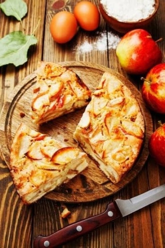 Шаг 4: Выложите нарезанные яблоки на дно формы для выпечки и равномерно их распределите. По вкусу можно посыпать яблоки молотой корицей.