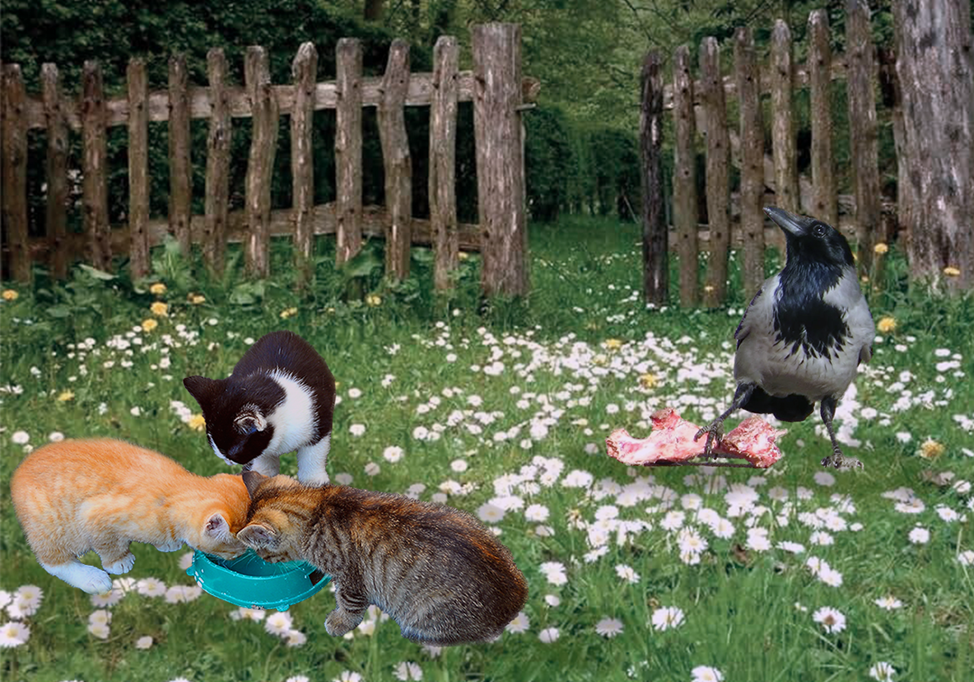 Котята родились недавно. Несмотря на разношёрстность, они были совершенно одинаковы по своей беспомощности и дерзкому стремлению познать неизведанный мир. Мама-кошка боялась надолго оставлять их одних, зная их неуёмную страсть к бесшабашному риску в сочетании с абсолютной незащищённостью. Однако изредка ей всё-таки приходилось отлучаться в поисках хлеба насущного, хотя сердобольные жильцы подъезда, приютившего кошачье семейство, подкармливали его, и подкармливали щедро: свежая рыба и молоко почти не выводились из рациона новорождённых, не говоря о специальном кошачьем корме, который они, впрочем, справедливо недолюбливали как продукт ненатуральный и коммерческий. Ворона, облюбовавшая полянку возле дома, их вкусов и взглядов не разделяла: однажды, пока котята выпутывались из клубка, в который они сплелись, устраивая «кучу малу», ворона, воровски поглядывая по сторонам, независимой походкой приблизилась к миске, никем не охраняемой и полной всяких вкусностей, наелась так, что ни охнуть