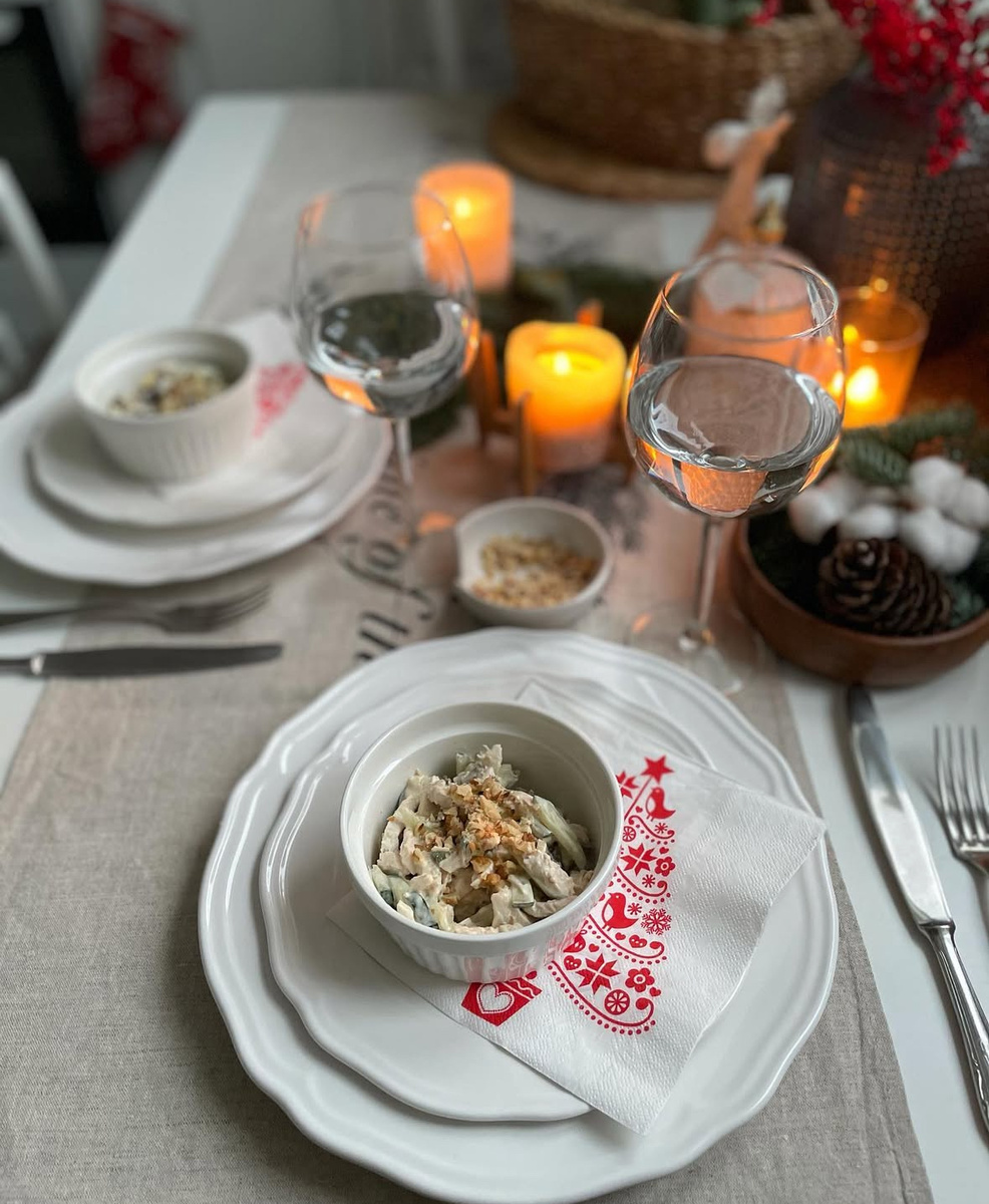 5 вкусных рецептов и оригинальная подача Мы с семьёй очень любим эти салаты и часто их готовим. Они идеально подойдут для вашего новогоднего стола! Я не буду указывать точное количество ингредиентов, так как всё зависит от ваших предпочтений. 1. Салат с курицей и черносливом Этот салат станет настоящим украшением любого стола. Вам понадобятся: Приготовление: Этот салат можно подать в креманке или невысоком стакане, выложив слоями. Сверху полейте соусом и украсьте орешками. Так всегда делает моя мама, и получается очень красиво! 2. Салат с рукколой, свеклой и сыром Фета Этот лёгкий и очень вкусный салат обязательно станет изюминкой вашего стола. Для его приготовления вам понадобятся: Приготовление: 3. Вальдорфский салат Этот интересный салат иногда можно приготовить без винограда, но с ним он становится ещё вкуснее. Вам понадобятся: Приготовление: Этот салат можно подавать как закуску, выложив на яблоко (но тогда яблоко в сам салат не добавляем). 4. Салат с курицей и ананасом Этот салат
