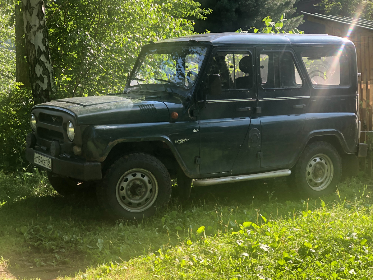 Выпуск нашего героя начался в 2003 г. Он пришел на смену модели УАЗ-3151 – модернизации классического советского УАЗ-469, о котором я писал здесь. В конструкции автомобиля еще угадываются черты предыдущей модели – ходовая часть, интегрированные в кузов «крылья», «плоский» передок и светотехника сразу ее выдают. Но прежде всего новая модель отличалась решеткой радиатора и цельнометаллической кабиной. Под капотом же был установлен модернизированный мотор объемом 2,8 л и мощностью 104 л. с., и с ним была состыкована 4-ступенчатая КПП, ведущая родословную от той, что стояла на классическом 469м. Запасное колесо располагалось, как и положено, сзади, а вместо откидного борта, открывающего доступ в багажник, появилась полноценная дверь: