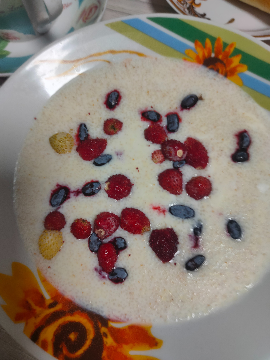 Итак, завтрак - молочная манная каша с клетчаткой, сладкая, ели ее с замороженными ягодами жимолости и садовой земляники,