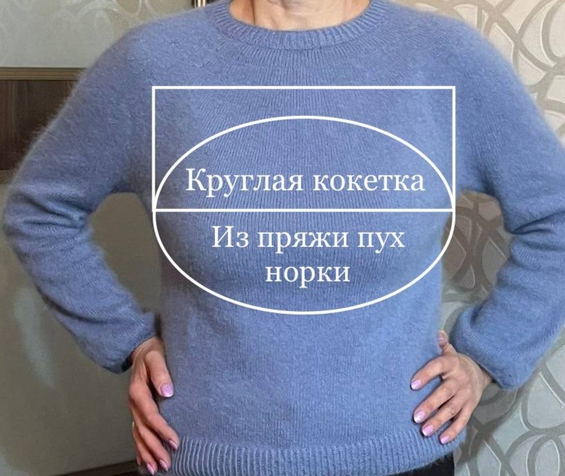 Круглая кокетка из пряжи пух норки 350м в 50г (1 основная и 1 добавочная нить). Набрано 140 петель +1 петля для замыкания в круг. Прибавки: 1 ряд - через 5 петель (140+20%)=140+28=168 петель 13 ряд - через 3 петли (168+56=224 петли) 24 ряд - через 4 петли (224+56=280 петель) 35 ряд - через 6 петель (280+46=326 петель) 45 ряд - через 10 петель (326+32=358 петель) 55 ряд - через 8 петель (358+44=402 петли) 65 ряд - через 9 петель (402+44=446 петель). Далее - 7см без прибавок, итого высота кокетки 25см (на размер 48-50). Мастер-класс по вязанию данной кокетки можно посмотреть по ссылке: