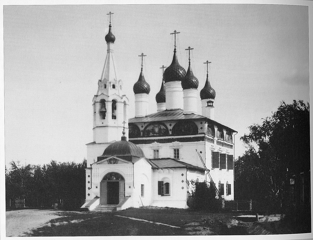 1900-1910 гг. Храм дал название Всехсвятской улице (с 1918 г. - Комитетская, с 1984 г. - Максимова). Но фактически церковь стояла на Пробойной улице (ныне Советской). Первое из сохранившихся упоминаний о деревянной церкви во имя Всех Святых содержится в Переписной книге Ярославля 1646 года. А в 1689 году на средства прихожан была построена каменная церковь. Дата освящения Всехсвятской церкви известна по надписи на кресте, хранившемся в алтарной части храма: «Водружен крест сей во храме святых и равноапостольных жен мироносиц лета 7202 [1694] месяца марта в 18 день на память иже во святых отца нашего Кирилла, архиепископа Иерусалимского. Бысть сей крест в церкви Всех Святых. В лето 7197 [1689] освятися алтарь… месяца мая в 22 день». Через 8 лет рядом построили зимнюю (тёплую) церковь Жён Мироносиц. В 1853 году она была перестроена в стиле классицизма. А в 1900 году на средства прихожан Всехсвятского храма Дмитрия Алексеевича Друженкова и его супруги Анны Николаевны (урожденной Гарцевой)